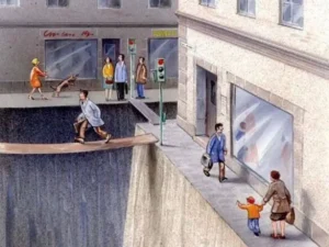 Karl Jilg is een kunstenaar die een tekening maakte om aan te tonen hoe de openbare ruimte verdeeld is. De straten geeft hij weer als kloven, zebrapaden als wankele planken en trottoirs als ondiepe richels.
