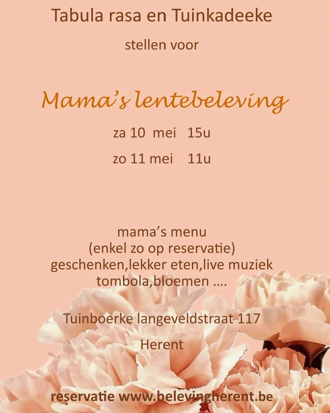Op zaterdag 10 en zondag 11 mei heten we je van harte welkom op mama's lentebeleving! Laat je onderdompelen in een sfeervol lentefeest vol gezelligheid, lekkernijen en muziek. Wandel langs enkele charmante kraampjes, geniet van heerlijke hapjes en drankjes en kom helemaal in de lentesfeer. Voor de jongste bezoekers is er een leuke kinderboerderij. Kom samen genieten van de sfeer, frisse energie en gezelligheid van het seizoen! Op zondag 11 mei, moederdag, maken we de dag extra speciaal met een heerlijk 3-gangenmenu. Geniet van een lekkere maaltijd aan een mooi gedekte tafel, met persoonlijke bediening en de optie om een prachtig boeket bloemen te bestellen. Vergeet je hiervoor zeker niet in te schrijven. Beleef, geniet en vier samen de lente!